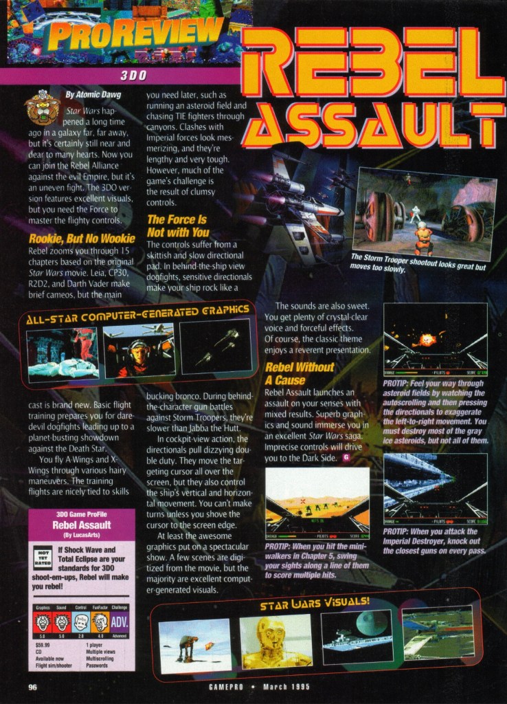 Star Wars: Rebel Assault is a full motion video rail shooter, where you take control of Rookie One, a moisture farmer turned Rebel pilot. Through trainings, missions against the Empire, and concluding with a daring assault on the Death Star, Star Wars: Rebel Assault is a must play for 3DO-owning Star Wars fans.