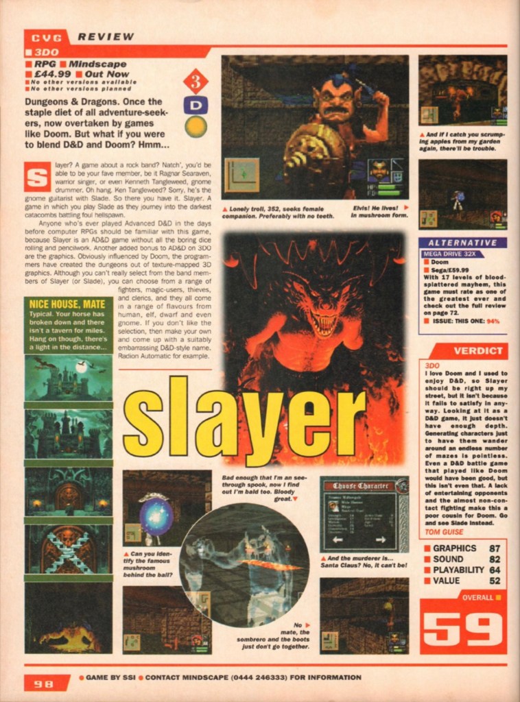 Advanced Dungeon & Dragons: Slayer Review Posted byChristopher CookMay 9, 2022April 25, 2022Posted inReview From Computer and Video Game magazine, January 1995. Score: 59 Share this: Click to share on X (Opens in new window) X Click to share on Facebook (Opens in new window) Facebook Like Loading...