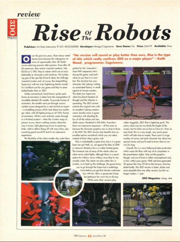 Rise of the Robots (3DO) Review from 3DO Magazine Posted byChristopher CookJuly 21, 2022Posted inReview Rise of the Robots (3DO) Review from 3DO Magazine, 1995/1996, Issue 1 Share this: Click to share on X (Opens in new window) X Click to share on Facebook (Opens in new window) Facebook Like Loading...