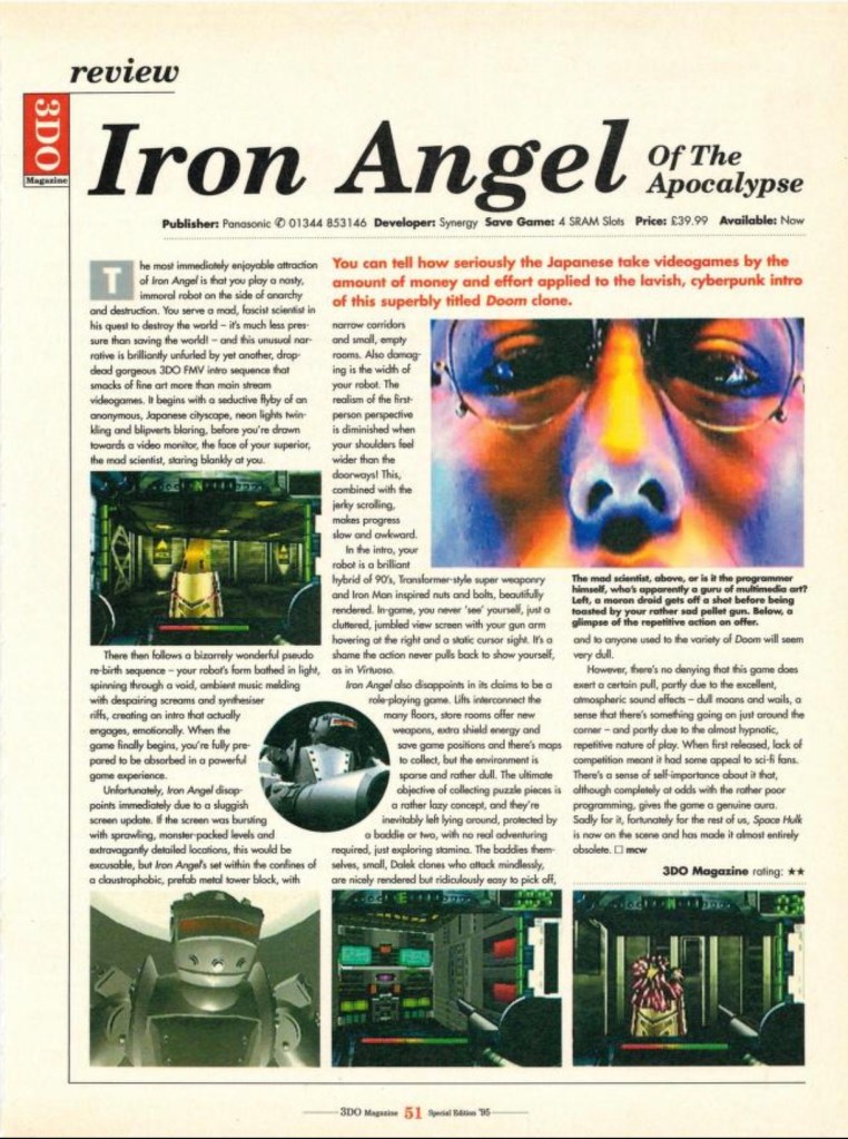 Iron Angel of the Apocalypse (3DO) Review from 3DO Magazine Posted byChristopher CookJuly 26, 2022Posted inReview Iron Angel of the Apocalypse (3DO) Review from 3DO Magazine, 1995/1996, Issue 1 Share this: Click to share on X (Opens in new window) X Click to share on Facebook (Opens in new window) Facebook Like Loading...