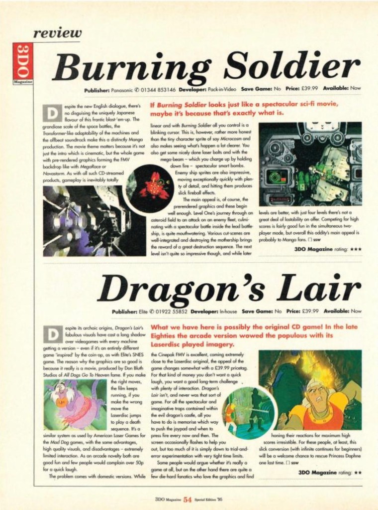 Burning Soldier / Dragon’s Lair (3DO) Review from 3DO Magazine Posted byChristopher CookAugust 2, 2022Posted inReview Burning Soldier / Dragon’s Lair (3DO) Review from 3DO Magazine, 1995/1996, Issue 1 Share this: Click to share on X (Opens in new window) X Click to share on Facebook (Opens in new window) Facebook Like Loading...