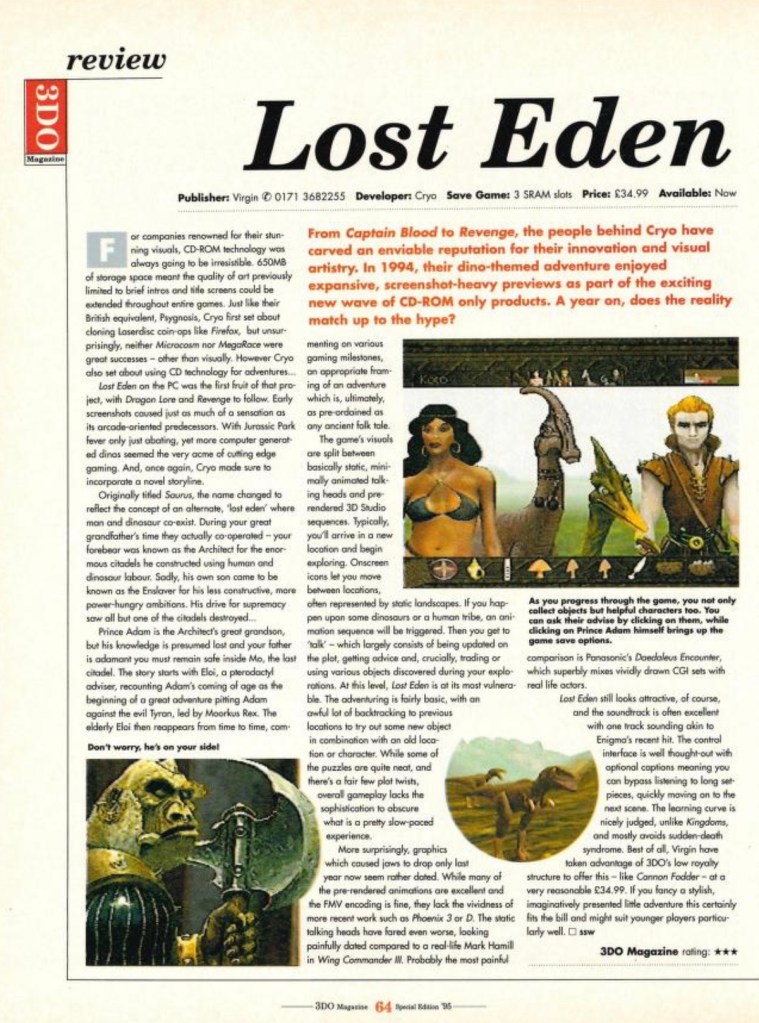 Lost Eden (3DO) Review from 3DO Magazine Posted byChristopher CookAugust 7, 2022Posted inReview Lost Eden (3DO) Review from 3DO Magazine, 1995/1996, Issue 1 Lost Eden (3DO) Review from 3DO Magazine, 1995/1996, Issue 1 Share this: Click to share on X (Opens in new window) X Click to share on Facebook (Opens in new window) Facebook Like Loading...