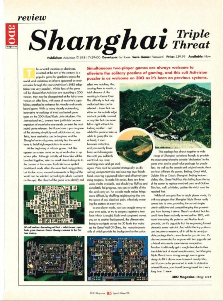 Shanghai Triple Threat (3DO) Review from 3DO Magazine Posted byChristopher CookAugust 14, 2022Posted inReview Flashback (3DO) Review from 3DO Magazine, 1995/1996, Issue 1 Share this: Click to share on X (Opens in new window) X Click to share on Facebook (Opens in new window) Facebook Like Loading...