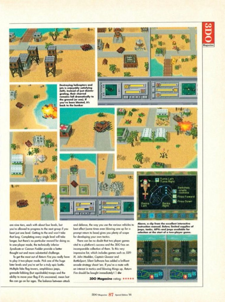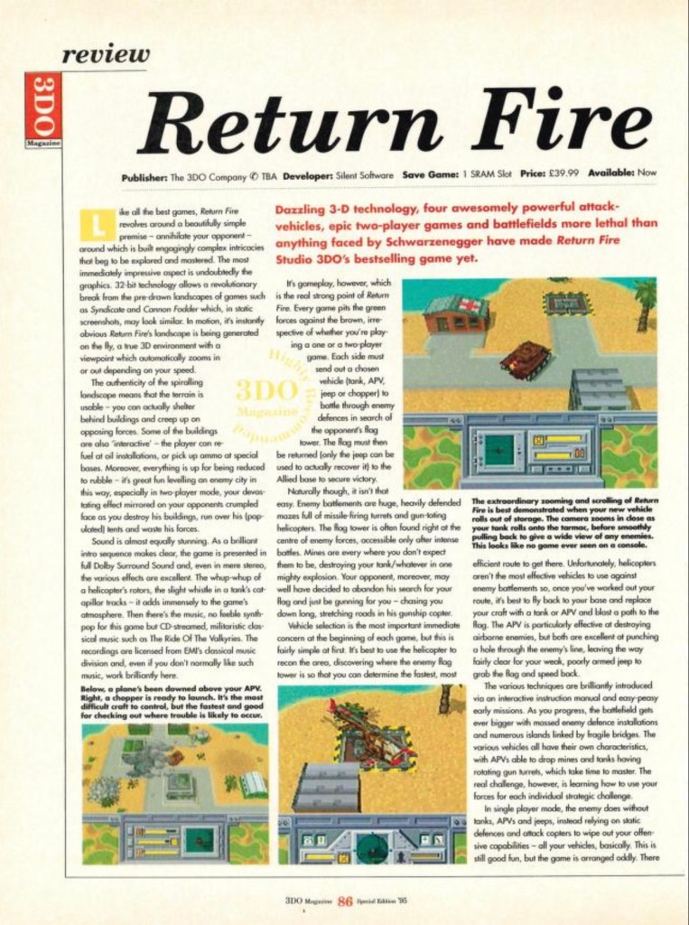 Return Fire (3DO) Review from 3DO Magazine Posted byChristopher CookAugust 17, 2022Posted inReview Return Fire (3DO) Review from 3DO Magazine, 1995/1996, Issue 1 Return Fire (3DO) Review from 3DO Magazine, 1995/1996, Issue 1 Share this: Click to share on X (Opens in new window) X Click to share on Facebook (Opens in new window) Facebook Like Loading...