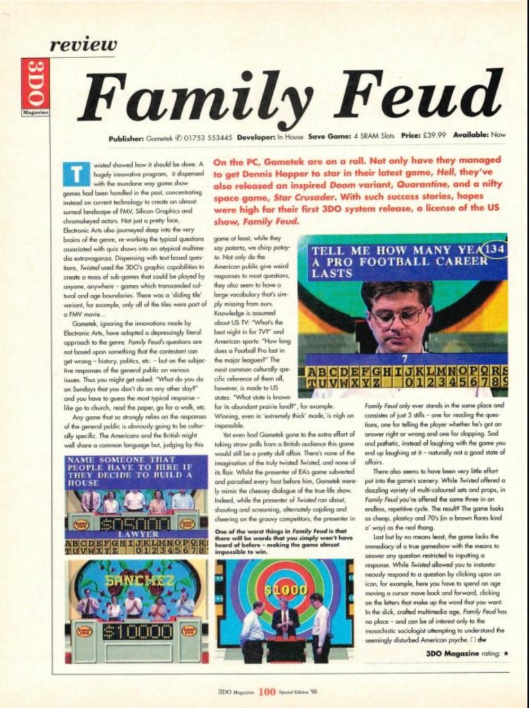 Family Feud (3DO) Review from 3DO Magazine Posted byChristopher CookAugust 25, 2022Posted inReview Family Feud (3DO) Review from 3DO Magazine, 1995/1996, Issue 1 Share this: Click to share on X (Opens in new window) X Click to share on Facebook (Opens in new window) Facebook Like Loading...