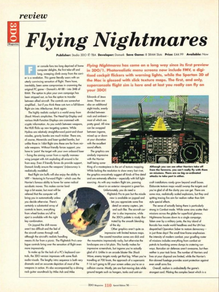 Flying Nightmares (3DO) Review from 3DO Magazine Posted byChristopher CookSeptember 2, 2022Posted inReview Flying Nightmares (3DO) Review from 3DO Magazine, 1995/1996, Issue 1 Flying Nightmares (3DO) Review from 3DO Magazine, 1995/1996, Issue 1 Share this: Click to share on X (Opens in new window) X Click to share on Facebook (Opens in new window) Facebook Like Loading...