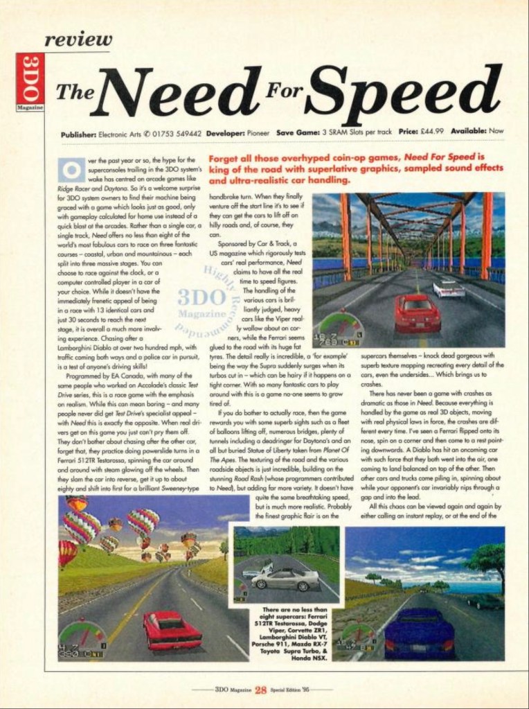 The Need for Speed (3DO) Review from 3DO Magazine Posted byChristopher CookSeptember 12, 2022July 1, 2022Posted inReview The Need for Speed (3DO) Review from 3DO Magazine, 1995/1996, Issue 1 The Need for Speed (3DO) Review from 3DO Magazine, 1995/1996, Issue 1 Share this: Click to share on X (Opens in new window) X Click to share on Facebook (Opens in new window) Facebook Like Loading...